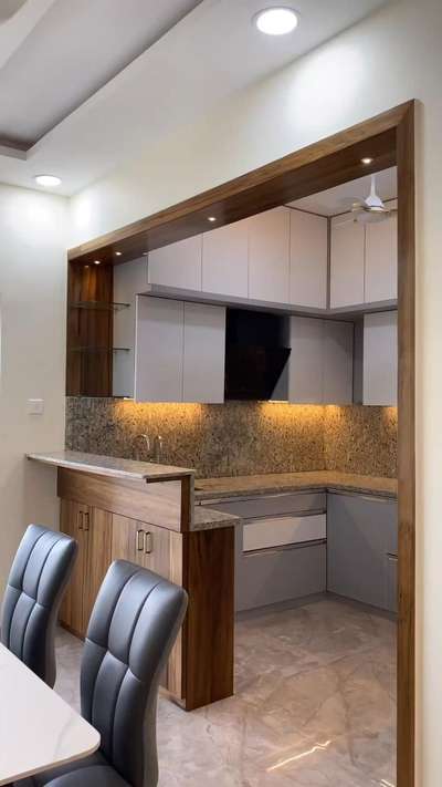 modular kitchen with grenite stone & wooden paneling