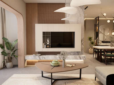 The indoor dining area of Cafe is designed as a warm, biophilic sanctuary, featuring arched wall niches and intricate patterned tile surfaces that add a sense of heritage to the modern layout. The space is defined by its striking suspended greenery installations with integrated halo lighting, which soften the structural lines of the timber-paneled ceiling. By combining earthy textures, curved geometric tables, and soft cream upholstery, the design achieves a cohesive, tranquil identity that seamlessly connects the intimate interior with the expansive views beyond. #Architect #architecturedesigns #Architectural&Interior #kerala_architecture #best_architect #cafè #cafeinterior