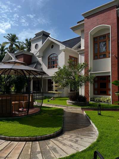 Modern Heritage: Sloped roofs, rich brick, and clean lines. This is how we blend the past with the present for the Residence of Mr.Mahesh and Family. โ#ModernTraditional #ArchitecturalDesign #HomeInspo #CustomHome #ExteriorDesign #DesignBuild #TraditionalHouse #Architect