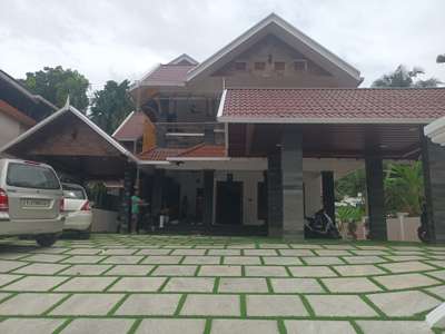 This Residence in Kodungallur is a premier example of "Modern Vernacular" architecture, masterfully blending regional heritage with luxury living. This climate-responsive sanctuary features a striking tiered terracotta roof system for natural cooling and a facade integrated with vertical wooden louvers and stone-textured fins to facilitate continuous cross-ventilation. The design utilizes a sophisticated material palette of exposed brickwork and warm wood tones, organized into a central two-story core with extended pavilion-style wings that ensure every space maintains a direct connection to the lush, landscaped surroundings. #ResidentialArchitecture #3BHKHouse / #4BHKHouse #SmallPlotDesign #BudgetFriendlyHome or #LuxuryResidential #HomeRenovation #ContemporaryArchitecture #TraditionalKeralaHome #TropicalModernism